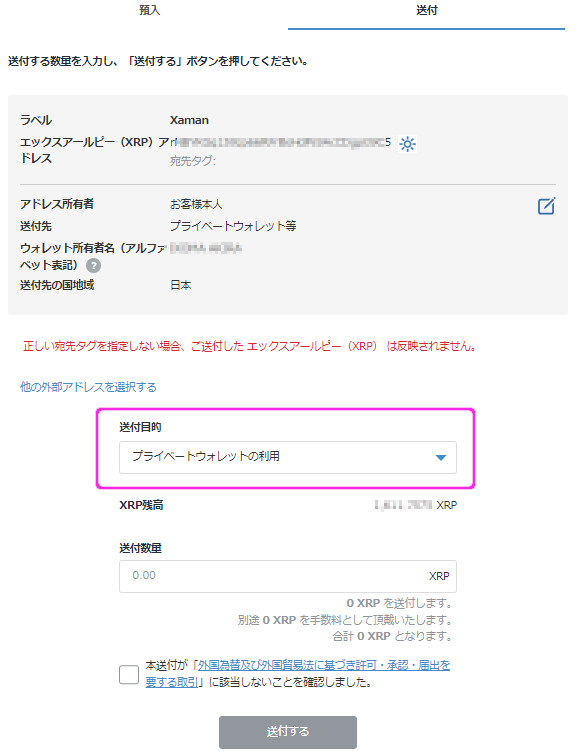 - 送付目的で、「プライベートウォレットの利用」